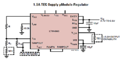1. ADI公司的LTM4663是一款采用小型封裝的完整1.5A吸入,源熱電冷卻器(TEC)穩(wěn)壓器。在支持熱敏電阻和RTD溫度傳感器的同時(shí),它可以提供和吸收高達(dá)1.5 A的電流