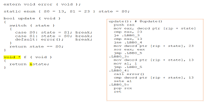 圖4:如果將新函數(shù)更改為返回指向我們的狀態(tài)變量的指針,則匯編代碼將發(fā)生重大變化。它不能得出結(jié)論13和23的值并不重要,因此它們現(xiàn)在已在匯編程序中明確表示
